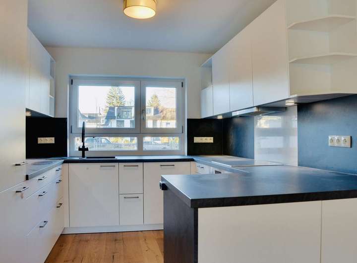 - Moderne Einbauküche mit weißen Hochglanzfronten sowie Granit-Arbeitsplatte und Glas-Spritzschutz, ausgestattet mit Ceranfeld, Dunstabzug, Backofen, Geschirrspüler, Kühl-Gefrier-Kombination