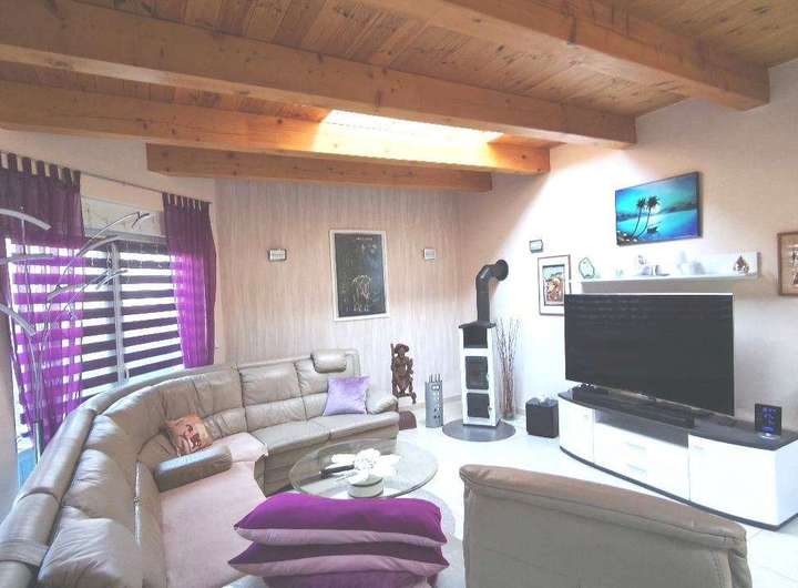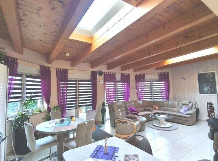 Optisch besticht der Wohnbereich durch die ansprechend gestaltete Echtholzbalkendecke, die sich auch in den Räumen des Obergeschosses wiederfindet.