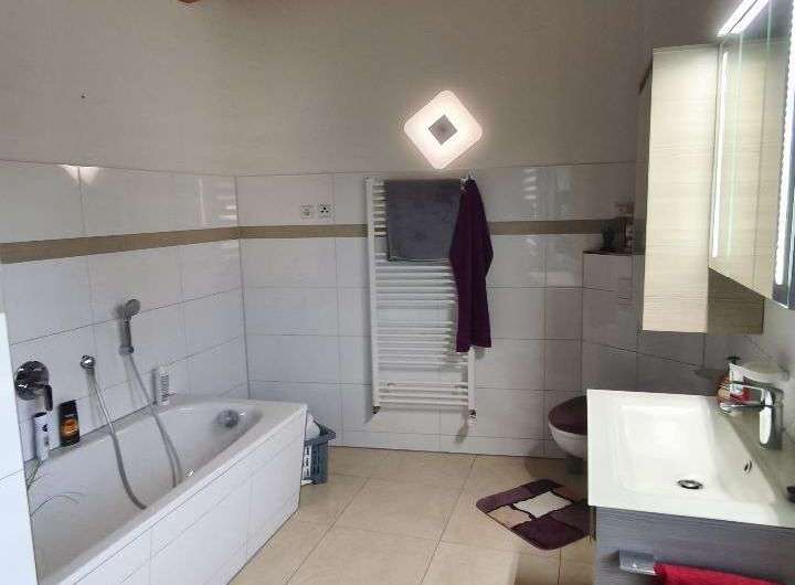 hochwertig gefliest mit wandhängendem WC, moderner Waschtischanlage, Badewanne, bodengleicher Echtglasdusche im OG