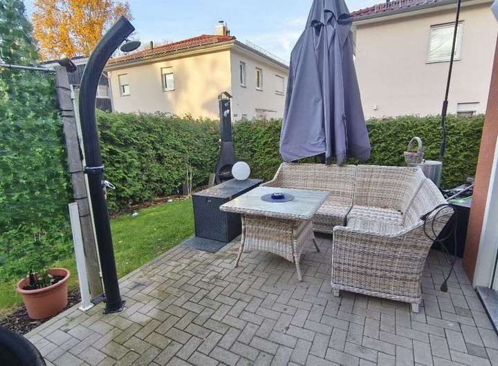 Vom Wohnbereich aus gelangt man über eine große Terrassen-Schiebetür direkt in den zugehörigen Gartenbereich mit der Terrasse. Diese bietet eine Sonnenmarkise und ist aufgrund der umlaufenden immergrünen Hecke vor fremden Blicken weitestgehend geschützt.