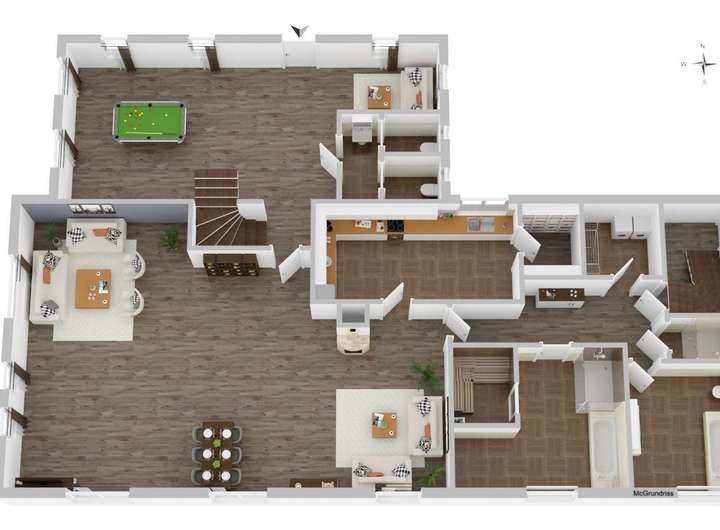 Erdgeschoss: große Diele mit Billiartisch, Flur und schöne Holztreppe zum OG., einladendes Wohn- und Esszimmer mit Kamin und direktem Zugang zur Terrasse, gemütlicher Küchen- bereich, 1. Badezimmer (Badewanne, Toilette, Bidet), Friesischer Luxus mit Wellnessbereich (Sauna, Whirlwanne und Erlebnisdusche), 3. Badezimmer (Dusche), separat getrenntes Damen- und Herren-WC.