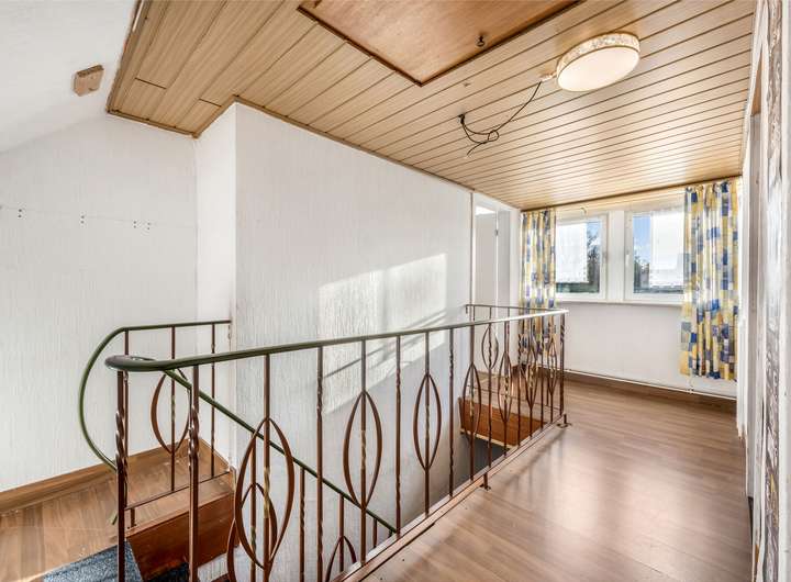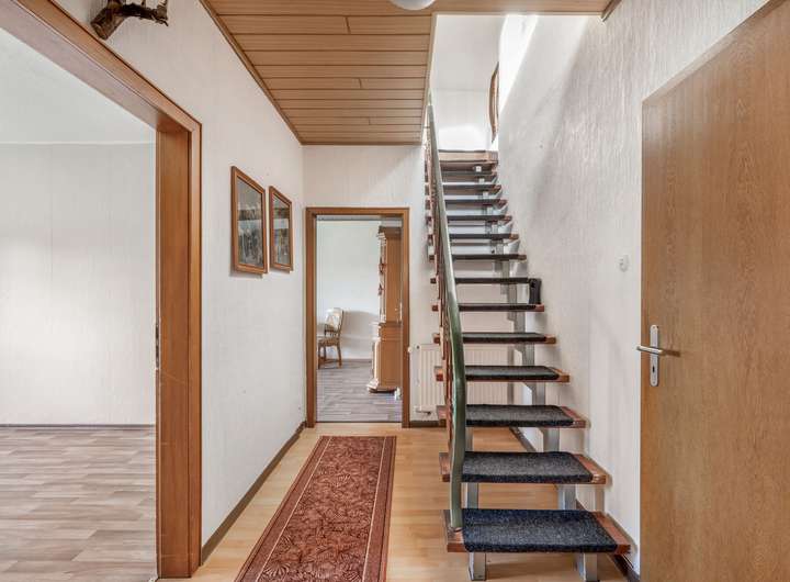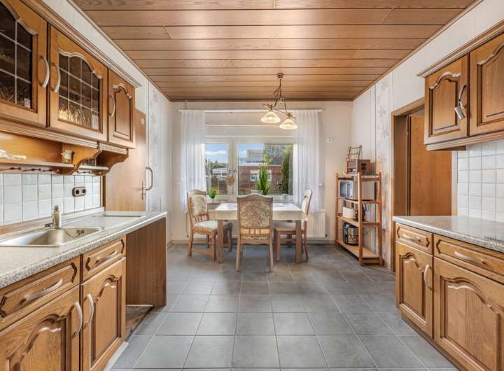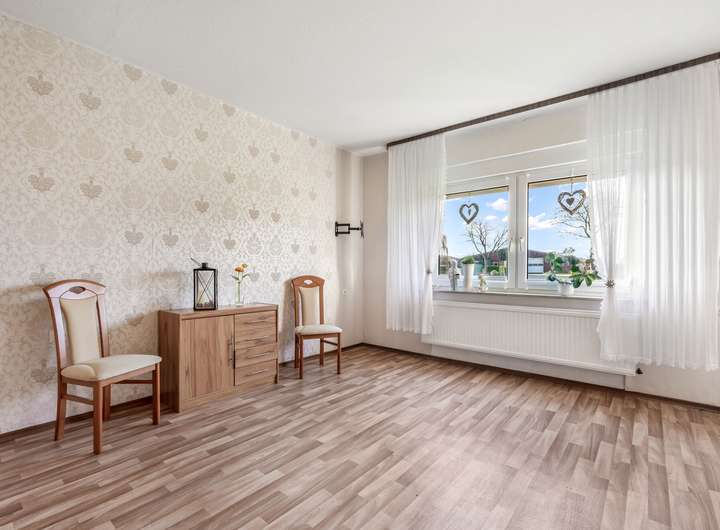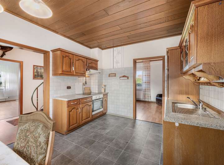 Im Erdgeschoss befinden sich ein Wohnzimmer, ein Esszimmer, eine Küche mit vorhandener Einbauküche (im Kaufpreis enthalten) sowie ein Schlafzimmer. Ergänzt wird diese Ebene durch ein im Jahr 2015 saniertes Tageslichtbad mit ebenerdiger Dusche und Waschmaschinenanschluss, ein separates WC sowie einen Hauswirtschaftsraum mit angeschlossenem Flurbereich. Von hier aus sind sowohl ein ehemaliger Wirtschaftsbereich als auch der Heizungsraum erreichbar. Zusätzlich steht ein praktischer Vorratsraum zur Verfügung. Ein weiterer Flur führt in das Dachgeschoss.