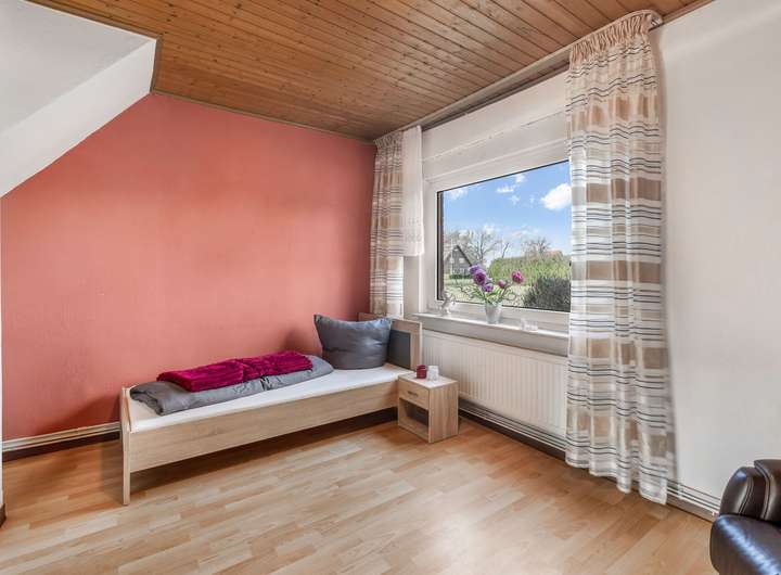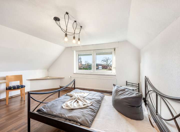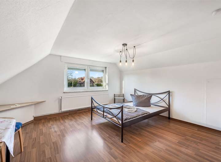 Im Dachgeschoss befinden sich zwei weitere Schlafzimmer, jeweils mit kleinen Speicherräumen im Drempel. Der Flurbereich bietet zudem Zugang zum Dachboden.