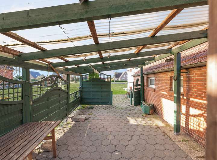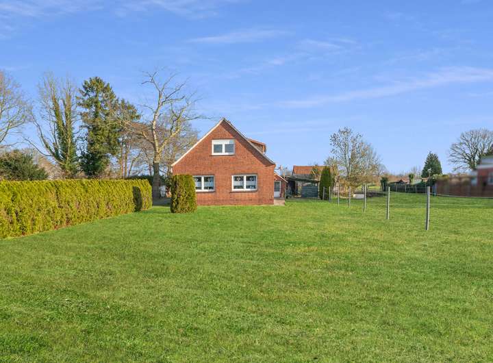 Der Außenbereich unterstreicht den ländlichen Charakter des Anwesens. Eine überdachte Terrasse, Gartenflächen, großzügige Rasenbereiche, ein eingezäunter Weidebereich, eine Mistplatte sowie eine zusätzliche Fertiggarage eröffnen vielfältige Möglichkeiten – von Tierhaltung und Selbstversorgung bis hin zu Hobby- oder Freizeitnutzung.