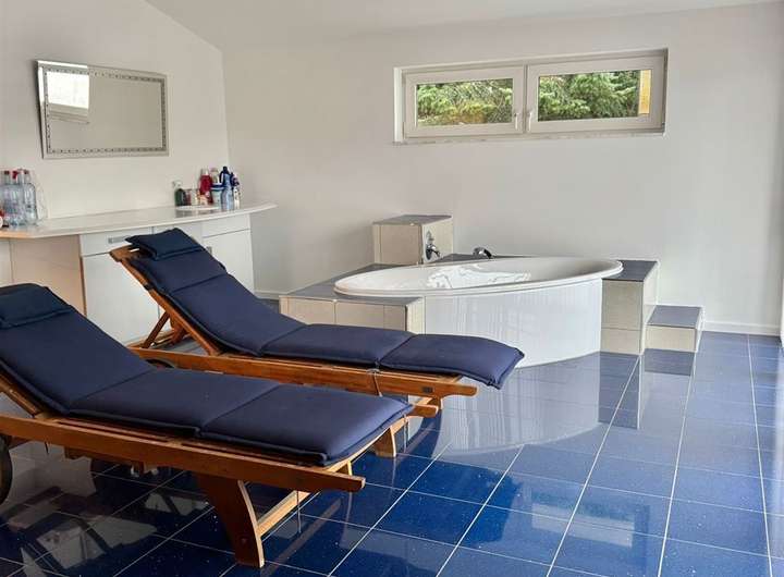 Im Obergeschoss erwartet Sie der exklusive Master-Bedroom-Bereich mit angrenzender Ankleide sowie einem beeindruckenden Wellnessbad. Dieses lässt keine Wünsche offen: Badewanne, großzügige Dusche, Sauna, Liegen und sogar ein Kühlschrank schaffen eine private Spa-Atmosphäre auf höchstem Niveau. Zusätzlich stehen ein weiteres Zimmer, ideal als Kinder- oder Arbeitszimmer, sowie eine separate Toilette zur Verfügung.