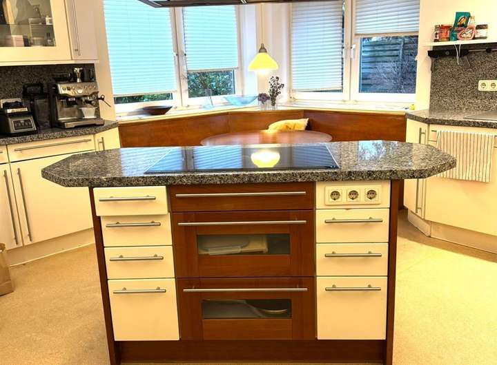 Die großzügige Küche bietet viel Platz zum Kochen, Genießen und Zusammenkommen. Ergänzt wird das Erdgeschoss durch ein stilvolles Gäste-WC. Von hier aus gelangt man zudem in den voll unterkellerten Bereich des Hauses.