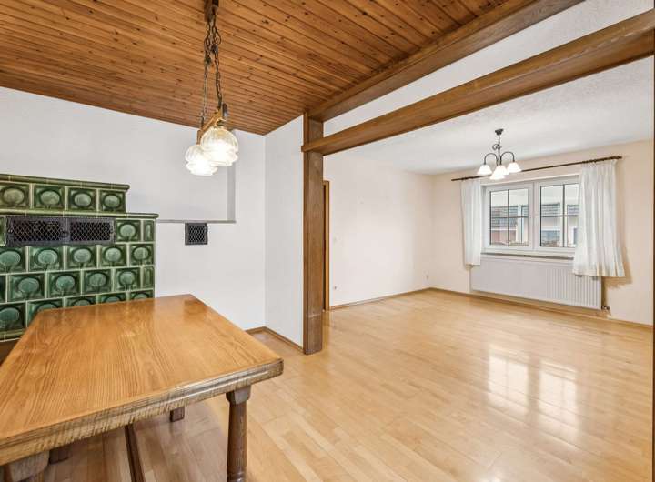 Ein Highlight und gleichzeitig Mittelpunkt des Erdgeschosses, das eine Wohnfläche von ca. 87 Quadratmetern bietet, ist der helle Wohnbereich. Der ist mit einem wunderschönen, grün gekachelten Ofen ausgestattet. Dieser sorgt an kalten Abendenden für Wärme und Behaglichkeit. Tagsüber können Sie im direkt angrenzenden Wintergarten gemütliche Stunden verbringen. Ansonsten finden Sie auf dieser Ebene verbunden über den Dielenbereich, Küche, Bad und Schlafzimmer. Der Flur führt zum Eingangsbereich und zur Treppe in das Obergeschoss.