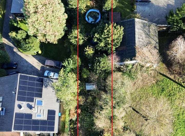 Aus der Vogelperspektive ist die großzügige Ausdehnung des Grundstücks sichtbar. Der vorhandene Baumbestand sorgt für Privatsphäre und eine natürliche Begrünung, die das Gesamtbild harmonisch abrundet.