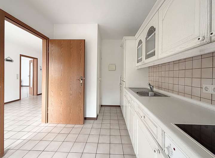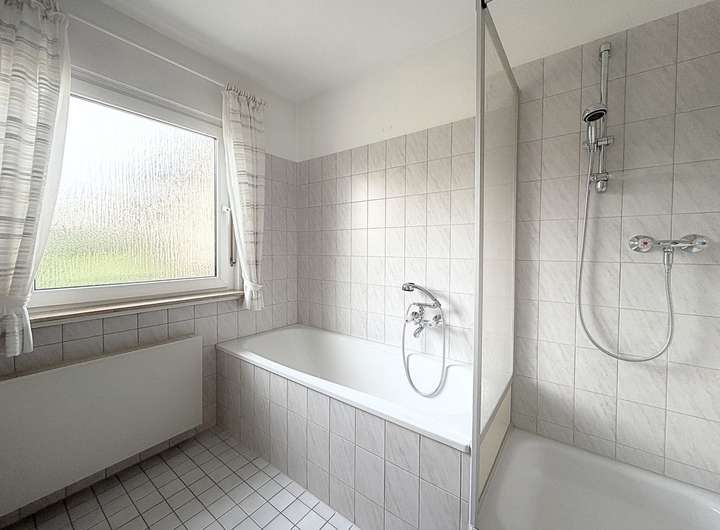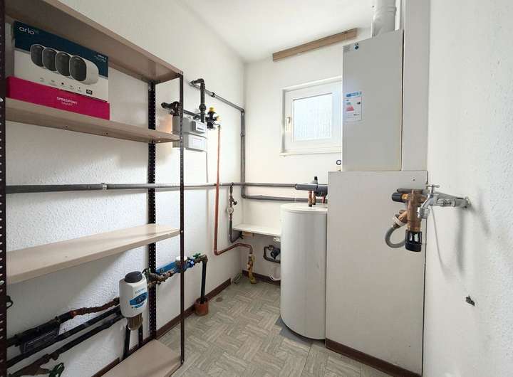 Die Küche ist mit einer Einbauküche ausgestattet und bietet viel Stauraum und Arbeitsfläche, um kulinarische Ideen umzusetzen. Zwei Schlafzimmer, ein Eltern- und ein Kinderzimmer, sowie ein Badezimmer mit Badewanne und separater Dusche runden das Wohnangebot ab. Ergänzend befindet sich ein Hauswirtschaftsraum mit moderner Gasbrennwerttherme aus dem Jahr 2019 im Erdgeschoss.