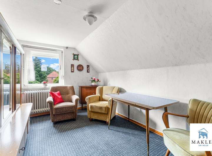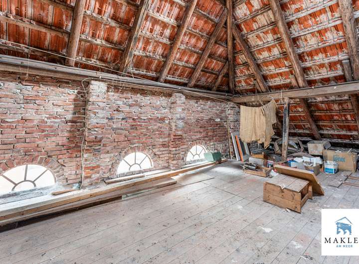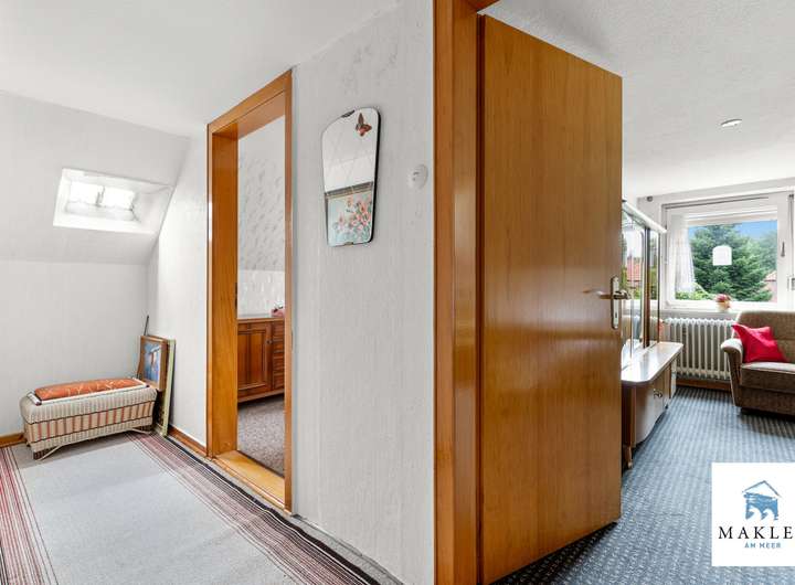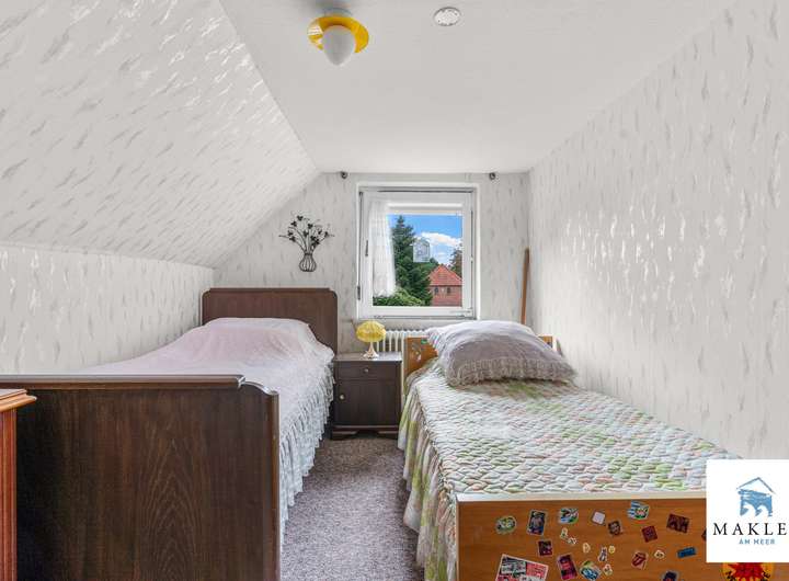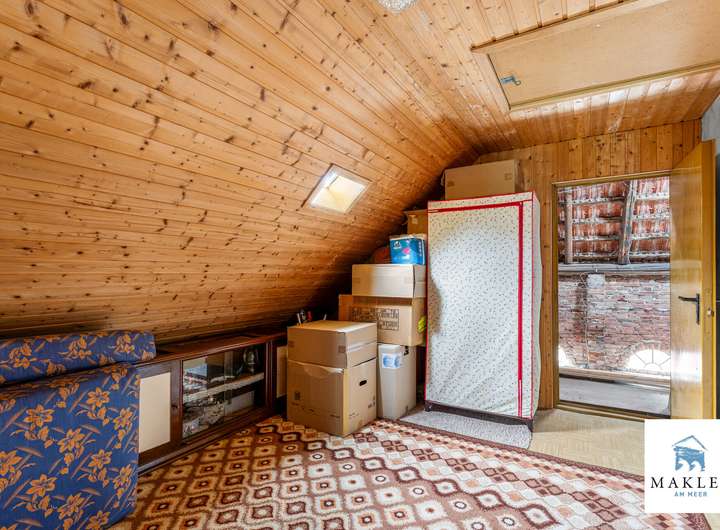 Im Obergeschoss erwarten Sie zwei Schlafzimmer im Giebelbereich, ein kleiner Flur sowie ein weiteres Zimmer. Über wenige Stufen erreicht man außerdem eine großzügige Ausbaureserve, die sich bis in den Spitzgiebel öffnet und vielseitige Nutzungsmöglichkeiten bietet – sei es als Atelier, Hobbyraum oder zusätzlicher Wohnbereich.