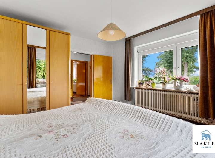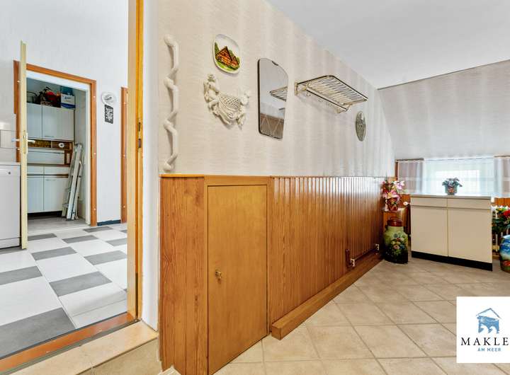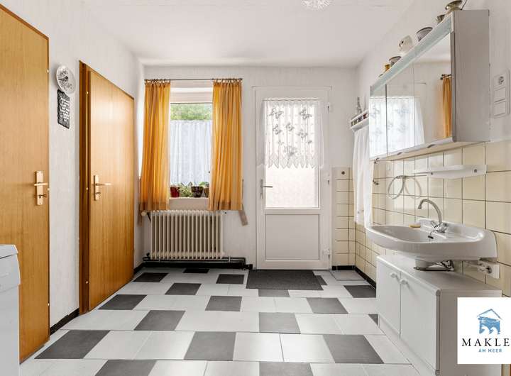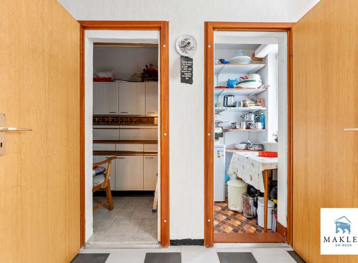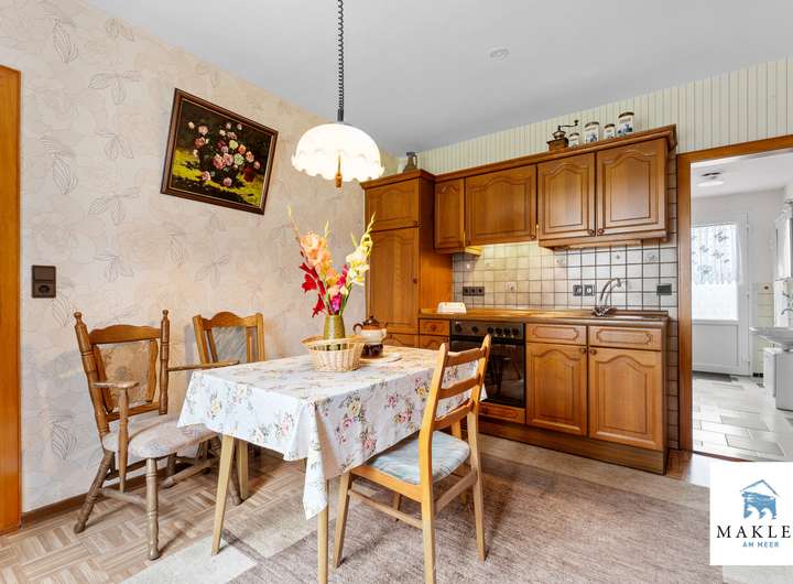 Im Erdgeschoss empfängt ein klassischer Flur, von dem sich die Räume in traditioneller Aufteilung erschließen. Links befindet sich ein Schlafzimmer, während sich geradeaus das Wohnzimmer mit direktem Zugang zur Terrasse öffnet – von hier genießt man den Blick in den weitläufigen Garten. Unter der Treppe wurde ein kleiner Abstellraum integriert. Rechtsseitig führt der Weg in die Küche, die mit ihrem Fenster den Eingangsbereich im Blick hat – ein typisches Detail ostfriesischer Wohnhäuser. Wer eine großzügige Wohnküche bevorzugt, kann den angrenzenden Hauswirtschaftstrakt mit Vorrats- und Abstellflächen unkompliziert einbeziehen und so einen modernen Lebensmittelpunkt für Kochen, Essen und Beisammensein schaffen.