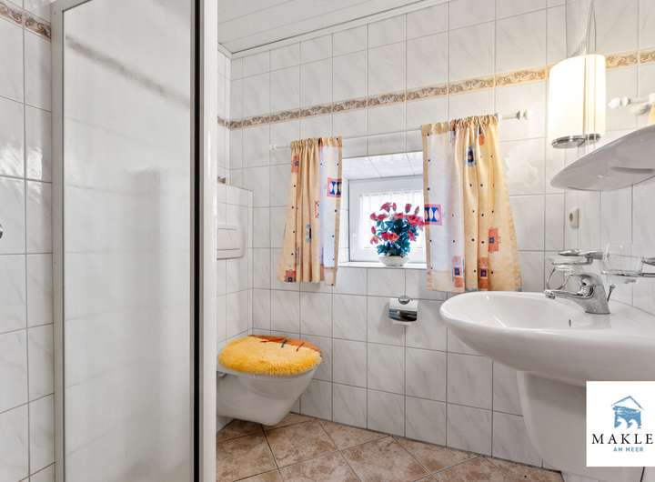 Modernisiertes Duschbad (1990er-Jahre) mit Eckdusche, WC, Handwaschbecken und Handtuchwärmer