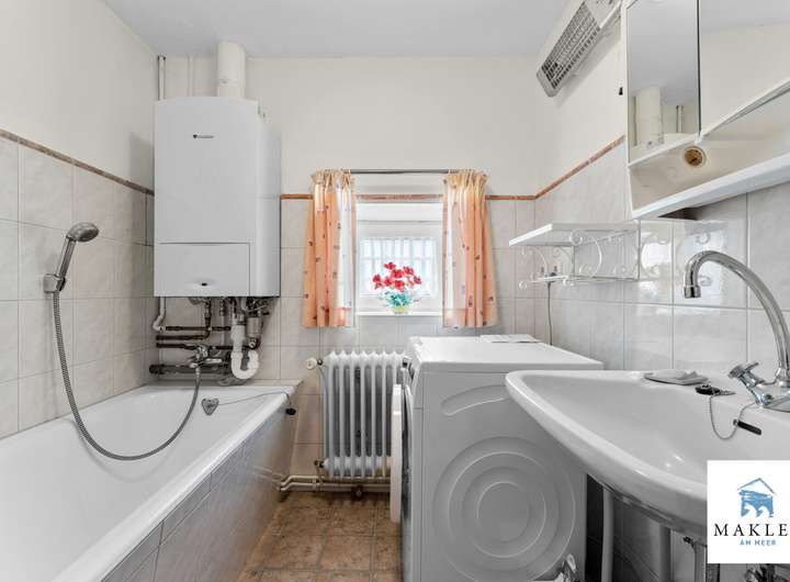 Wannenbad mit Handwaschbecken, Waschmaschinenanschluss und untergebrachter Gastherme