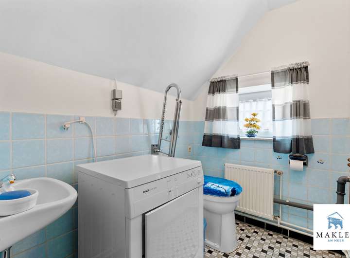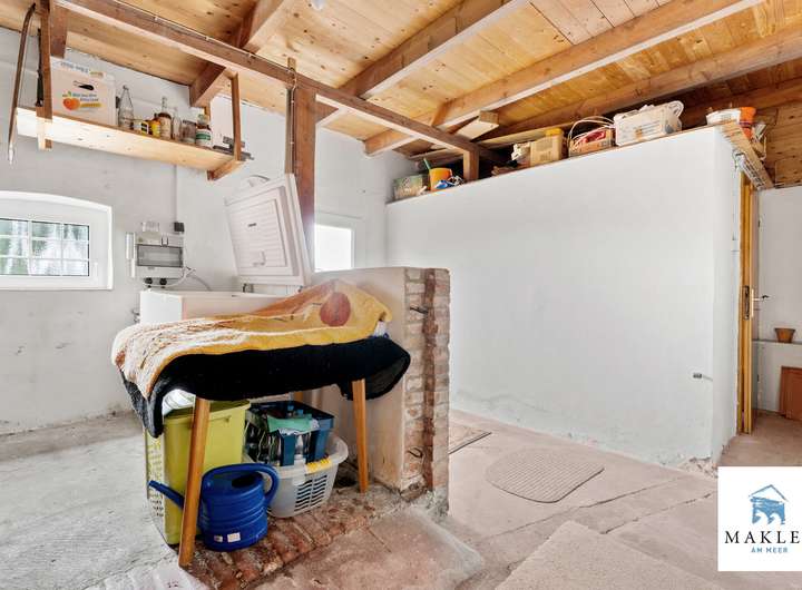 Von diesem hinteren Bereich gelangt man auch in den Sanitärtrakt, der sich über eine kleine Stufe erschließt. Hier stehen drei Bäder zur Verfügung: ein WC mit Handwaschbecken im Stil der 1960er-Jahre samt Waschmaschinenanschluss, ein Wannenbad mit zusätzlicher Waschmaschinenmöglichkeit und der dort untergebrachten Gastherme von Junkers (aus 2020) sowie ein modernisiertes Duschbad aus den 1990er-Jahren mit Eckdusche, WC, Handwaschbecken und Handtuchwärmer. Daran anschließend befindet sich weiterer Abstell- und Lagerraum, der früher als Stall diente und über einen separaten Zugang ins Freie verfügt.