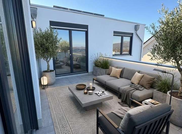 Um Ihnen das volle Potenzial dieser Räume aufzuzeigen, wurden die Bilder mittels "Virtual Staging" digital möbliert. Bitte beachten Sie, dass die visualisierten Einrichtungsgegenstände (wie der dargestellte Whirlpool, die Sauna, die Kücheninsel oder spezielle Einbauschränke) nicht Teil des Angebots sind. Übergeben wird das Haus im frisch renovierten und unmöbilirten Zustand, inklusive der oben beschriebenen Küchenzeile (ohne Kochinsel).