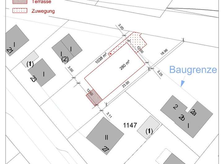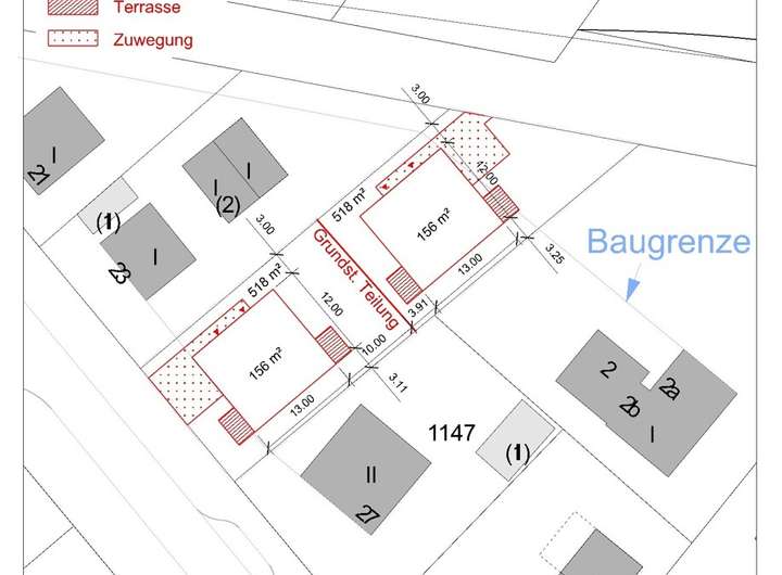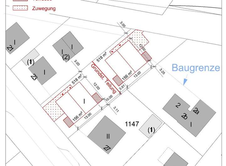 Alle notwendigen Anschlüsse an öffentliche Versorgungseinrichtungen (Strom, Wasser, Abwasser, Gas) befinden sich auf dem Grundstück. Auf dem Grundstück stehen keine größeren Bäume, die eine Bauplanung einschränken. In einer Bauvoranfrage (siehe Skizze) wird die Möglichkeit der Bebauung mit 2 Doppelhäusern (4 Wohneinheiten) geklärt. Das Grundstück liegt zwischen 2 ruhigen Anliegerstraßen, sodass auch eine weitere Zufahrt zu dem hinteren Teil des Grundstücks möglich wäre.