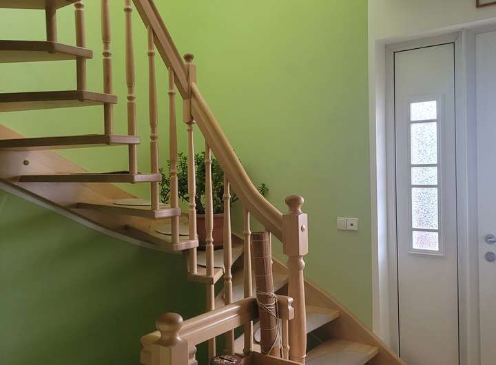 Das Obergeschoss ist über eine breite Wendeltreppe zu erreichen. Hochparterre und Obergeschoss sind separat voneinander nutzbar (separate Wohnungseingangstüren).