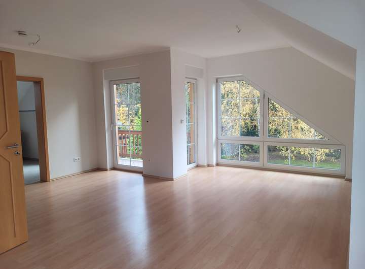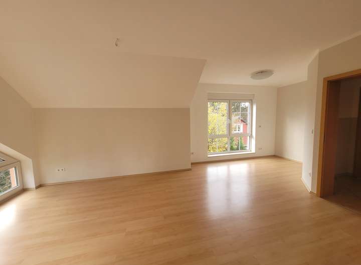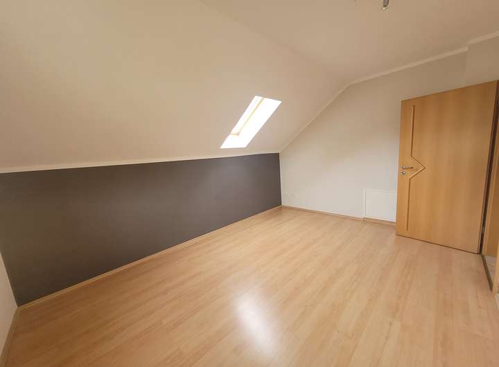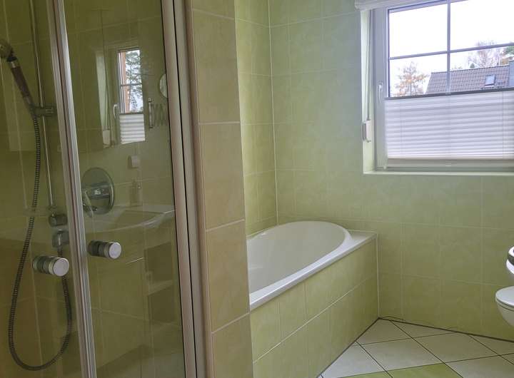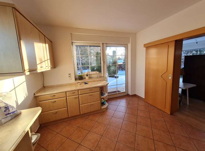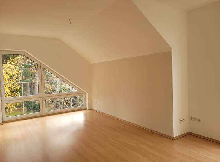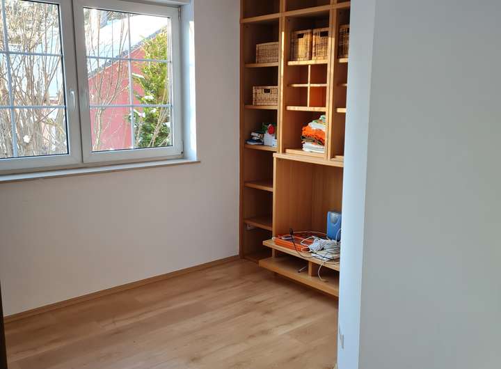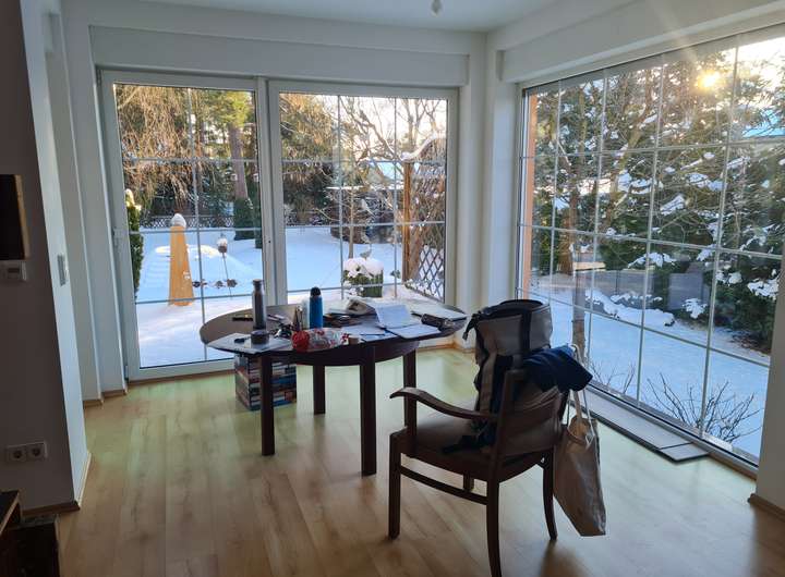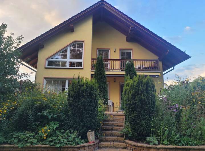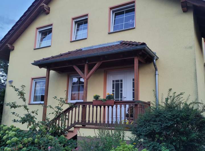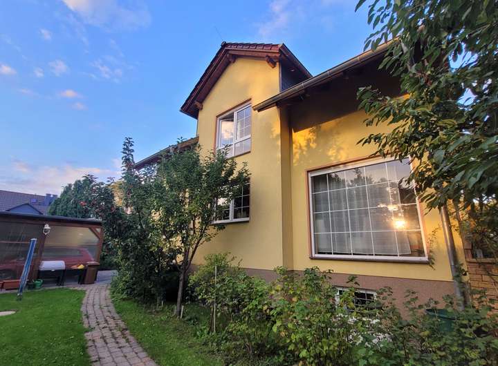 Das freistehende Einfamilienhaus mit großem Gartengrundstück ist ab Februar/März 2026 zu vermieten. Es besteht aus zwei Geschossen sowie einem Keller. Hochparterre und Obergeschoss/Dachgeschoss bestehen je aus zwei Zimmern (je eins ist ca. 15 m² groß, das zweite jeweils ca. 28 m²) sowie einer Küche (mit Einbauküche, Spülmaschine, Herd/Ofen, Kühlschrank sowie Platz für einen kleinen Essbereich) und einem Bad (Dusche, Badewanne, WC, Waschtisch, Handtuchtrockner). Bodenbeläge sind Laminat (in den Wohnräumen) und Fliesen (in Bad, Küche, Flur). Zum Obergeschoss/Dachgeschoss gehört ein Balkon, zum Hochparterre gehört eine Terrasse, jeweils nach Süden ausgerichtet. Alle Fenster sind mit elektrischen Rollläden versehen.