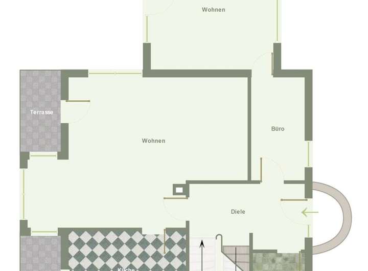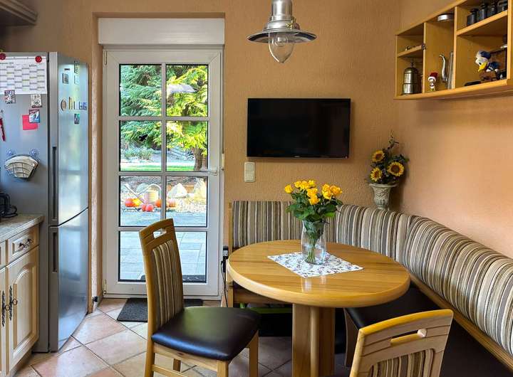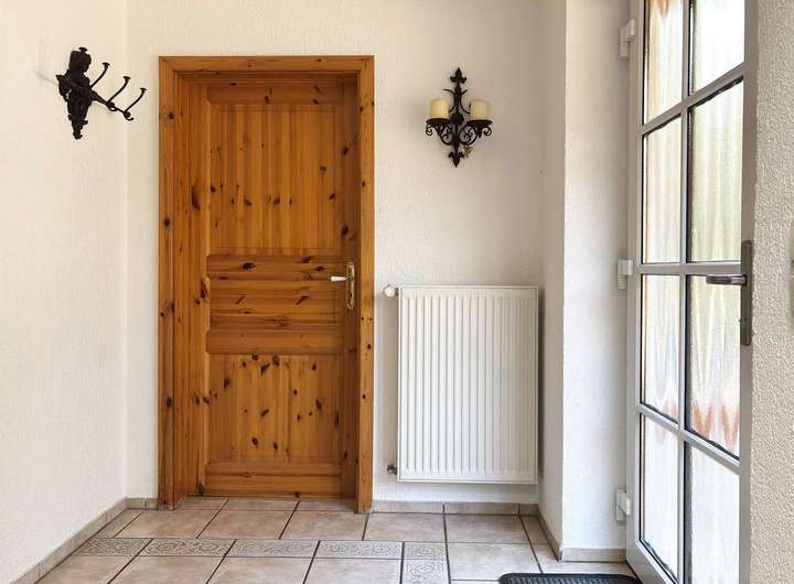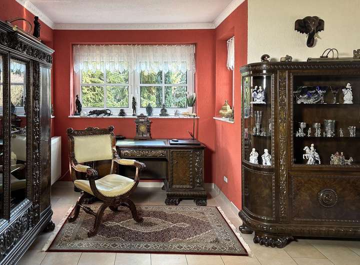 Rechts vom Eingangsbereich befindet sich ein kleines, charmantes Homeoffice-Zimmer, das zugleich den Durchgang in das lichtdurchflutete Terrassenzimmer bildet – dieser später entstandene Anbau schafft zusätzlichen Wohnraum und bietet vielfältige Nutzungsmöglichkeiten.