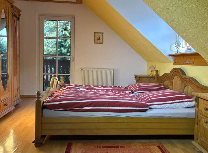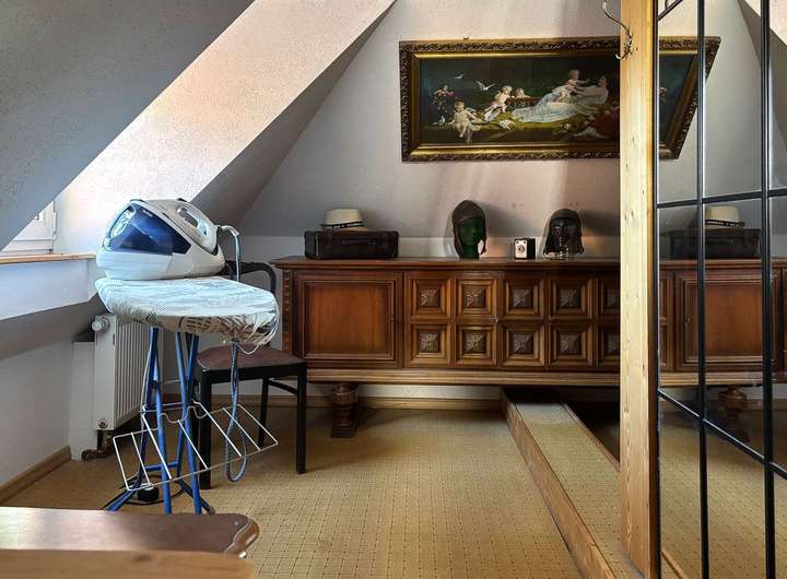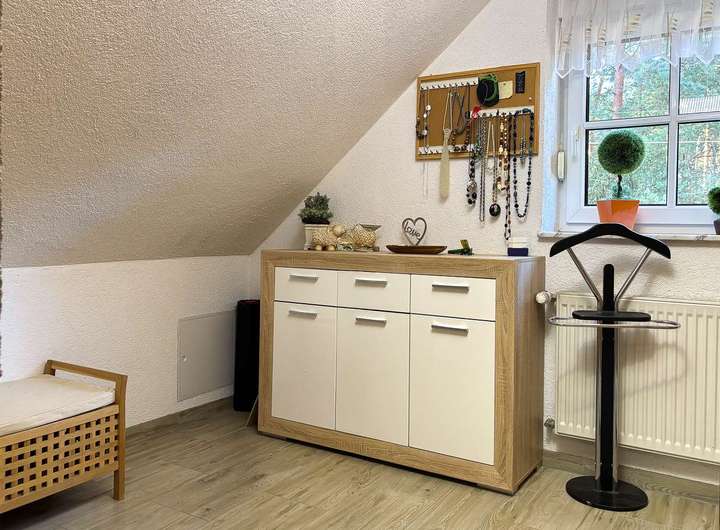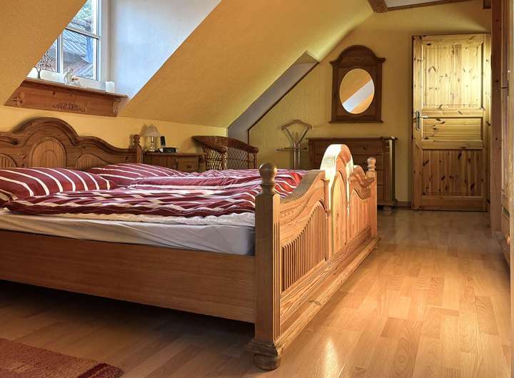 Im Obergeschoss finden Sie ein gemütliches Schlafzimmer, ein weiteres Zimmer sowie ein kleineres Raumangebot, das derzeit als Ankleidezimmer genutzt wird. Durch den späteren Anbau des Terrassenzimmers ist zudem ein zusätzlicher Raum entstanden, der im ursprünglichen Grundriss nicht verzeichnet ist – ein echtes Plus an Flexibilität und Möglichkeiten.