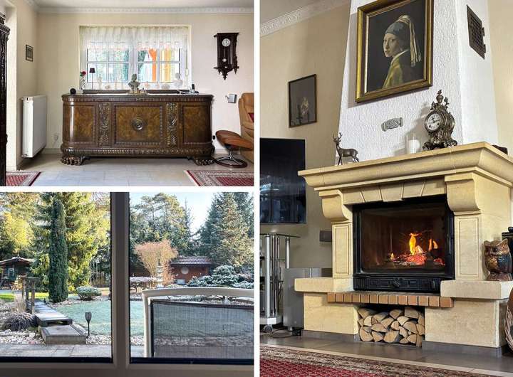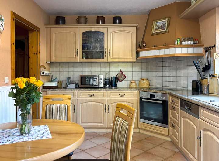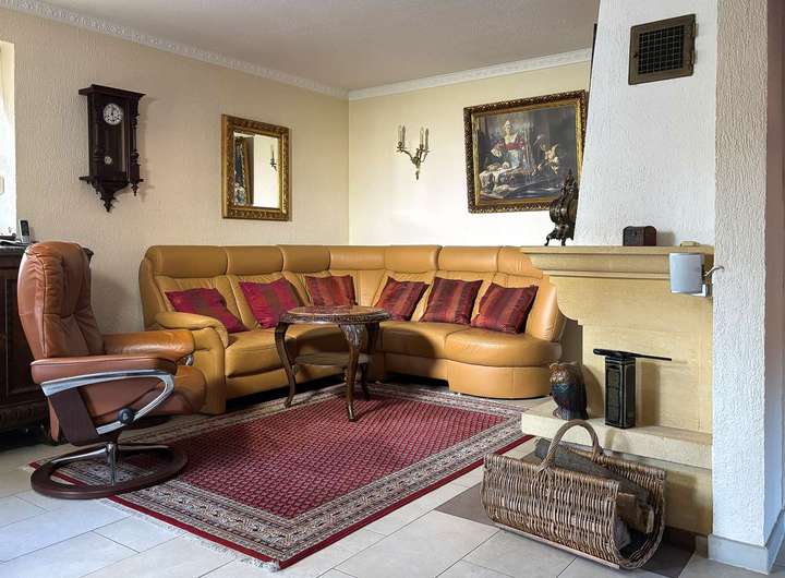 Zurück im Flur liegt auf der linken Seite das Duschbad. Geht man geradeaus weiter, eröffnet sich der Zugang zur Küche, die sich links anschließt, sowie zum behaglichen Wohn- und Kaminzimmer auf der rechten Seite. Besonders der Kamin schafft hier eine warme, einladende Atmosphäre – ein Ort, an dem man die Zeit gern vergisst.