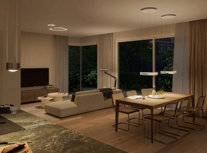 Bodentiefe Fenster, hohe Decken und edle Materialien wie Eichenparkett erzeugen ein helles, einladendes Ambiente. Ein durchdachtes Occhio-Lichtkonzept setzt zusätzlich besondere Akzente.