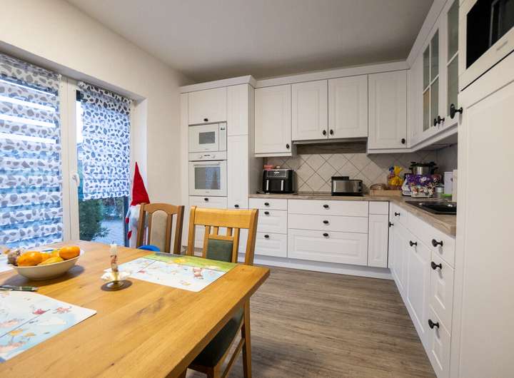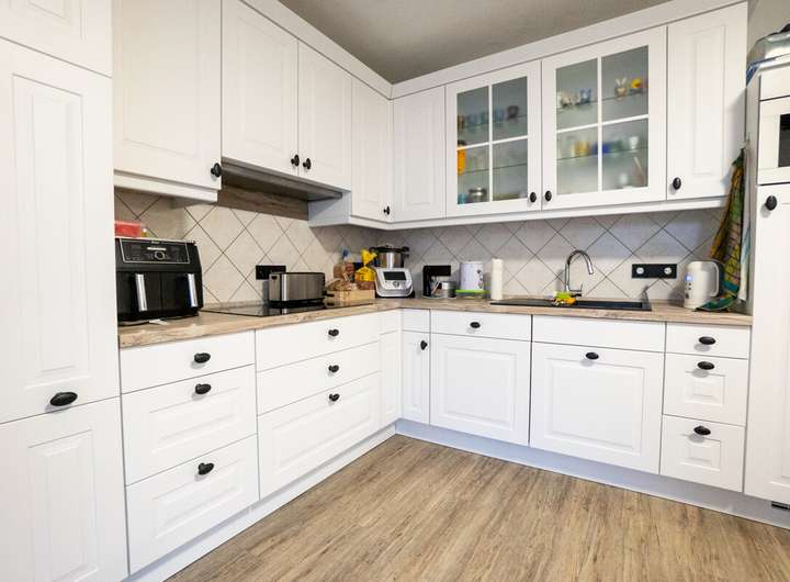 - Einbauküche in Weiß mit hochwertigen Geräten
