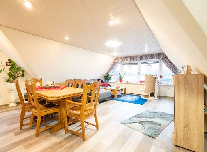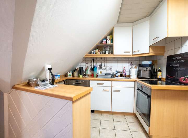 Das Obergeschoss verfügt über drei Schlafzimmer, einen Abstellraum, ein Badezimmer mit Badewanne sowie einen großzügigen Wohnbereich mit integrierter Küchennische. Die Küche im Obergeschoss ist bereits eingebaut, sodass diese Etage bei Bedarf als eigenständige Wohneinheit genutzt werden kann. Durch den vorhandenen Nebeneingang lassen sich Erd- und Obergeschoss vergleichsweise einfach voneinander trennen, wodurch beispielsweise eine separate Oberwohnung realisierbar ist.