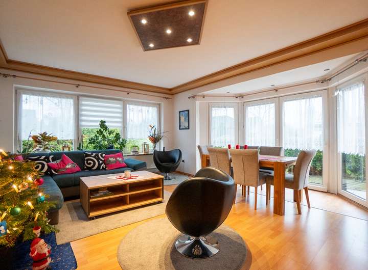 Das Erdgeschoss bietet ein komfortables und gut geschnittenes Raumangebot. Hier befinden sich ein Schlafzimmer, ein Büro oder Gästezimmer, eine Küche mit hochwertiger Einbauküche und modernen Elektrogeräten sowie direktem Zugang zur Terrasse, ein teilweise modernisiertes Badezimmer mit Badewanne und Dusche, ein separates Gäste-WC, ein Abstellraum sowie ein großzügiger Hauswirtschaftsraum. Besonderes Highlight ist das helle und weitläufige Wohnzimmer mit Erker, das durch seine Größe und die guten Lichtverhältnisse eine angenehme Wohnatmosphäre schafft.