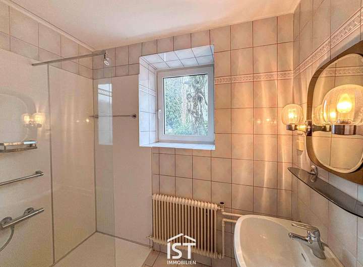 Weiter befinden sich im Erdgeschoss ein kleines Büro, ein saniertes Badezimmer mit barrierefreier Dusche sowie ein separates WC. Ein praktischer Abstellraum bietet zusätzlichen Stauraum. Der Waschmaschinenanschluss befindet sich im Hauswirtschaftsraum, von dem aus man ebenfalls direkt in den Garten gelangt, der vielfältige Nutzungsmöglichkeiten bietet und viel Platz zum Entspannen, Spielen oder Gestalten lässt.