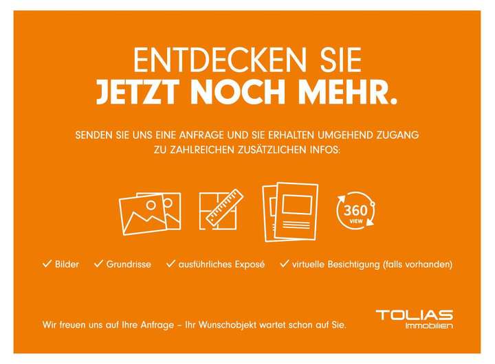 1. Senden Sie uns eine Anfrage und erhalten Sie ein ausführliches Exposé mit weiteren Bildern, Grundrissen, der Objektadresse, detaillierten Objektinformationen und sofern vorhanden eine virtuelle Besichtigung.