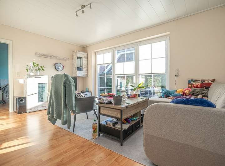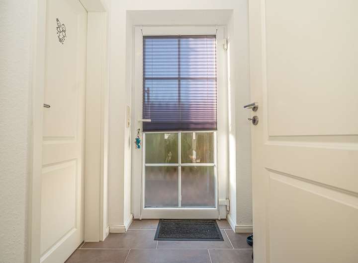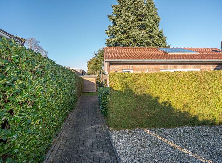 Die Aufteilung des hübschen Wohnhauses, mit sehr flachem Satteldach und moderner Solarthermie für die Brauchwassererwärmung, ist gemütlich und effizient gewählt. Ein Windfang ermöglicht den Zutritt zum Haus, von dem ein praktisches Gäste-WC, sowie der Zugang zum großen Wohnbereich gegeben ist. Der Wohnbereich ist durch seine großen 3-fach verglasten Fenster lichtdurchflutet und bietet zudem genug Platz für einen Esstisch und eine gemütliche Sofaecke. Eine separate Küche mit nützlicher Einbauküche steht ebenso zur Verfügung.