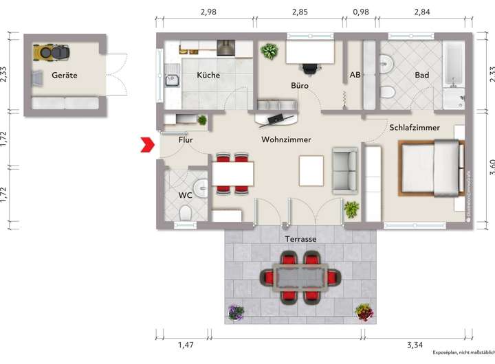 EG: Wohnzimmer, Schlafzimmer, Büro, Küche, Bad, Gäste-WC, Flur; Geräteschuppen, Terrasse