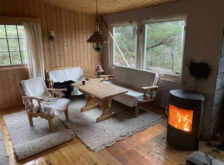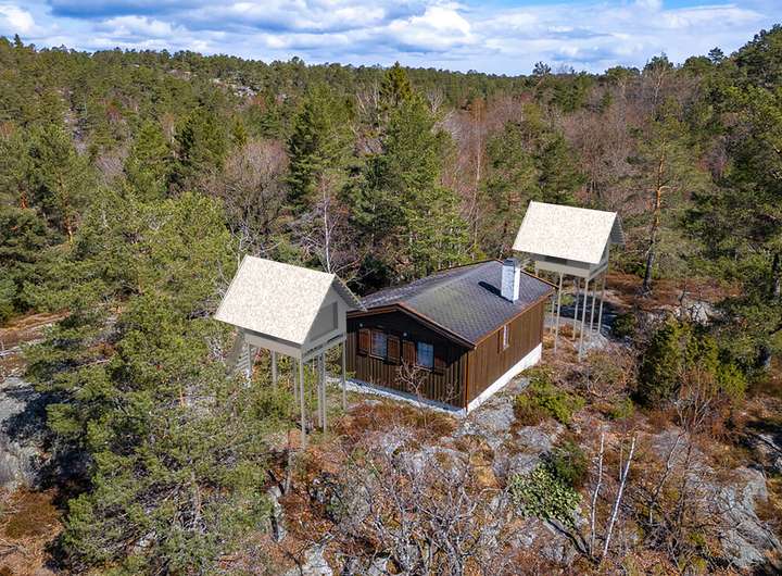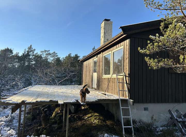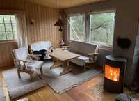 Schönes Ferienhaus mit großer Terrasse und viel Sonne. Es liegt ca. 1,5 km vom Meer entfernt, idyllisch in einem Waldgebiet gelegen. Unverbaute Aussicht. Biotoilette, Solaranlage und Wasseranschluss per Schlauch aus dem Bach.