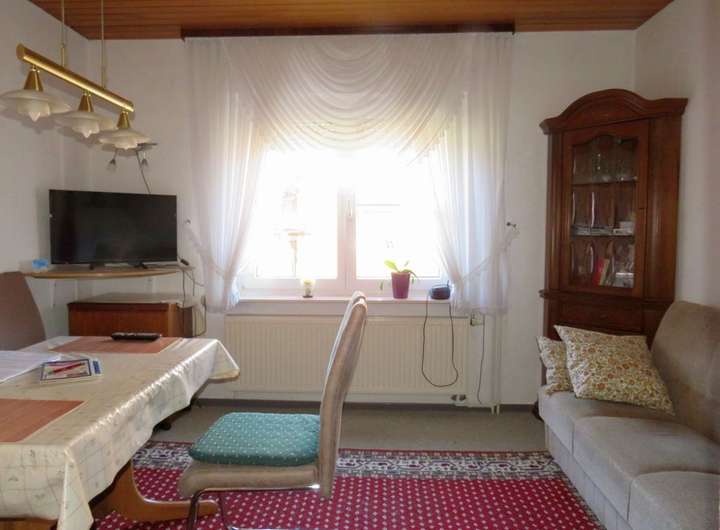 Im Erdgeschoss befinden sich ein Wohnraum mit angrenzendem Schlafraum, ein Badezimmer sowie Küche und Essbereich. Unter der Treppe im EG ist ein praktischer Abstellraum vorhanden.
