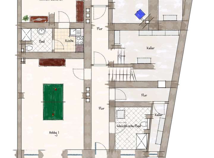 Im KG (Souterrain) steht Ihnen neben einem Hauswirtschaftsraum, Bad u. div. Kellerräumen u. Hobby-,u. Fitnessraum, noch eine ca. 40qm große Einliegerwohnung (1x Wohn/Schlafzimmer + Bad + Küche) mit separatem Eingang zur Verfügung.