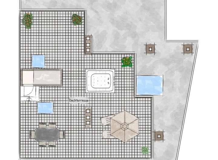 Im Dachgeschoss befinden sich 2 weitere Schlafzimmer mit angrenzender Terrasse, ein Gäste-, bzw. Arbeitszimmer, der großzügige Wellnessbereich mit Sauna, Solarium u. Duschbereich u. ein zusätzliches Badezimmer mit WC. Die darüberliegende Dachterrasse (ca. 50qm) wird über einen entsprechenden Treppenvorraum/Treppe erschlossen.