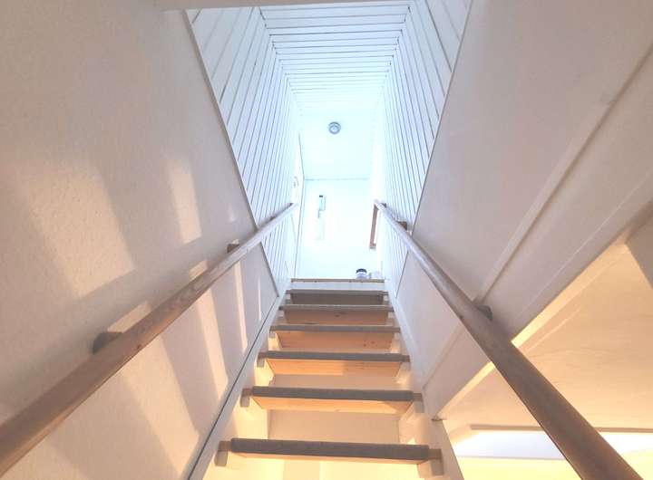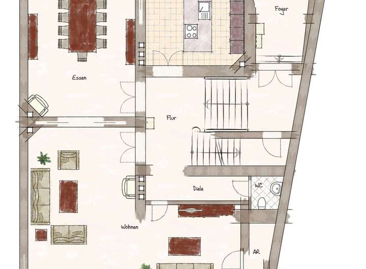 Eine geräumige Wohnküche (Sonderanfertigung Küche Marke Bulthaup), ein Abstell-, bzw. Vorratsraum, das ausladend, offen angelegte Treppenhaus u. ein Gäste-WC komplettieren den Wohn- u. Nutzbereich im Erdgeschoss.