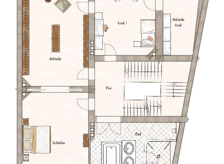 Im Obergeschoß befinden sich 2 Schlafzimmer mit angrenzenden Ankleidezimmern und das Hauptbad mit XXL-Dusche u. Badewanne. An beiden Schlafzimmern (Vor-u. Rückseite) schließt jeweils ein Balkon an. Im Zwischengeschoss (Treppenhaus) befindet sich noch ein weiterer großer Abstellraum.