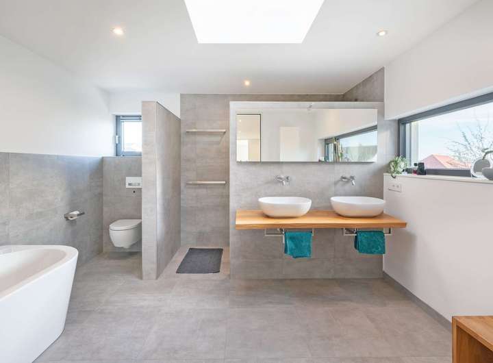 • großes Hauptbad mit bodengleicher Walk-in-Regen-Dusche und Badewanne
