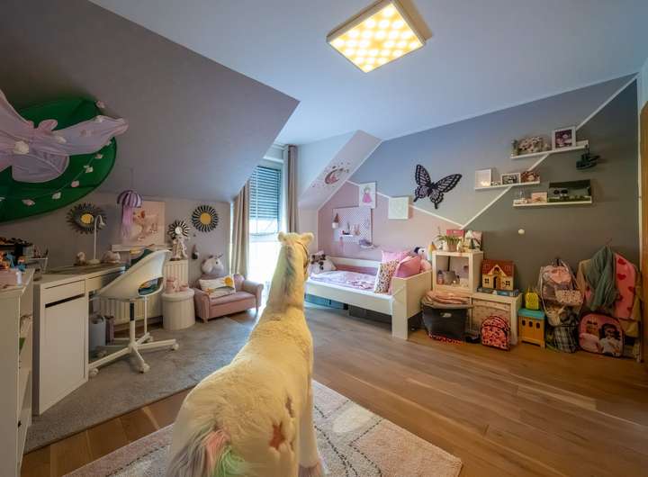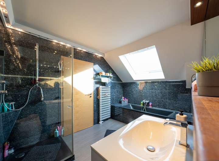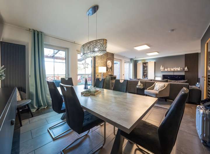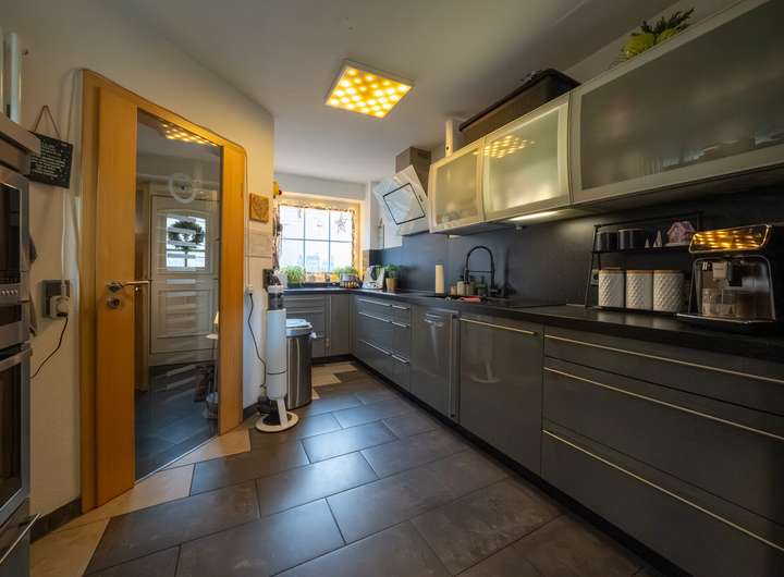 Bereits beim Eintritt setzt das Haus ein Statement: edler schwarzer Granit in Diele und Treppe verleiht eine elegante, zeitlose Atmosphäre. Der lichtdurchflutete Wohn- und Essbereich überzeugt mit Offenheit und Wärme – nicht zuletzt dank des gemütlichen Kaminofens, der für stimmungsvolle Abende das ganze Jahr über sorgt. Die moderne Küche integriert sich harmonisch und bietet viel Platz für Kochen, Genuss und gemeinsame Momente.