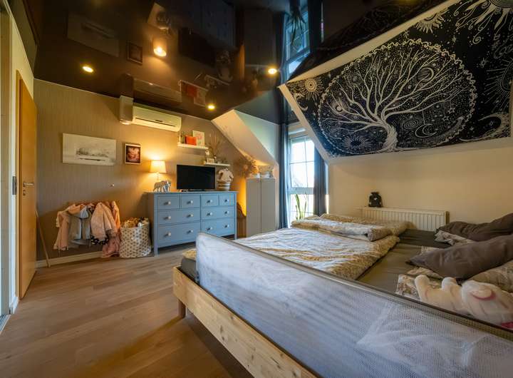 Im Obergeschoss finden sich zwei gut geschnittene Schlafzimmer. Eines davon punktet mit Klimaanlage und einer hochwertigen Lackspanndecke, die das Raumgefühl zusätzlich veredelt. Das gepflegte Badezimmer, eine gemütliche Terrasse mit kleinem Garten sowie ein eigener Stellplatz runden das Gesamtpaket ideal ab.