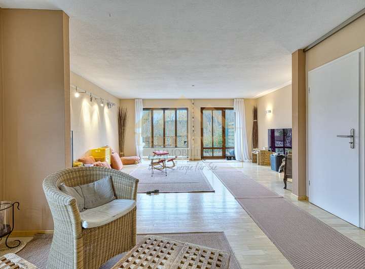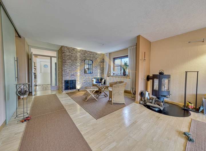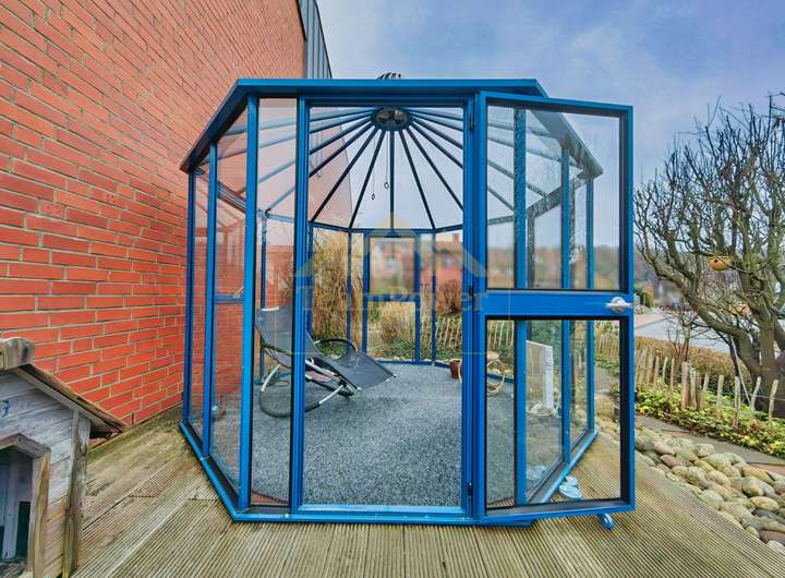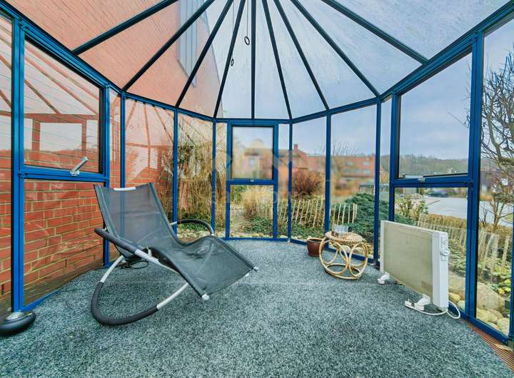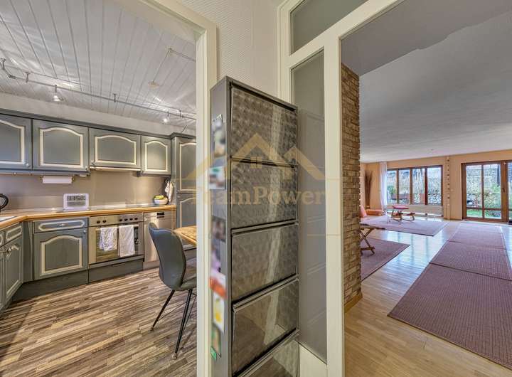 Herzstück des Hauses ist der offen gestaltete Wohn- und Essbereich mit großen Fensterflächen, die für viel Tageslicht sorgen und einen direkten Zugang zur Terrasse und in den liebevoll angelegten Garten ermöglichen. Ein besonderes Highlight stellt der separate Wintergarten / Glaspavillon dar, der zusätzlichen Wohnkomfort bietet und zu jeder Jahreszeit einen geschützten Rückzugsort schafft.