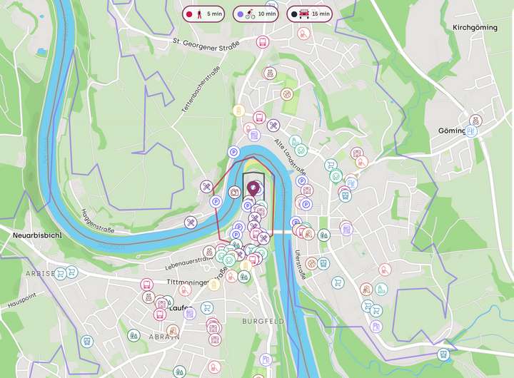 Der Anschluss an den öffentlichen Nahverkehr ist ausgezeichnet, mit einer Bushaltestelle am Marienplatz in etwa 280 Metern Entfernung und dem Oberndorf Bahnhof, der rund 570 Meter entfernt liegt, was eine einfache Anbindung sowohl an lokale als auch an überregionale Zielorte gewährleistet. Für Vielflieger ist der nächstgelegene internationale Flughafen Salzburg in ungefähr 20 Kilometern Entfernung eine ideale Option.