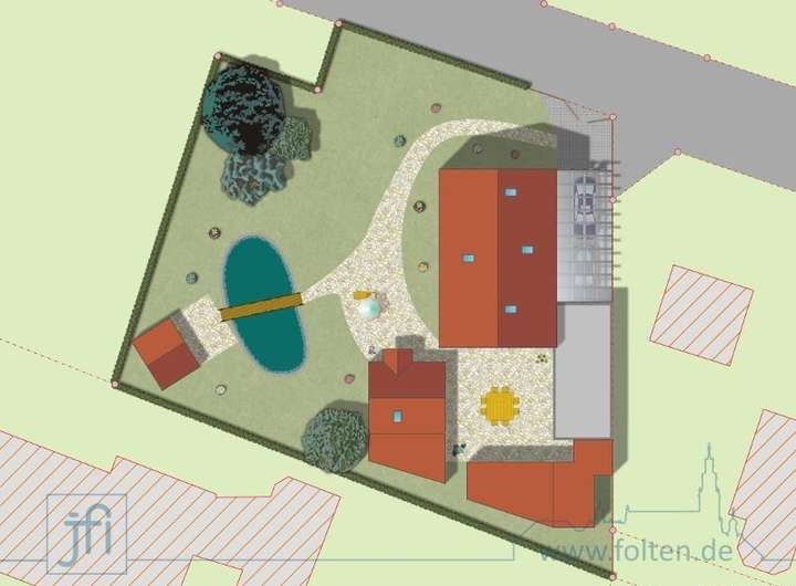 Das angrenzende Baugrundstück zur Größe von 974 m² ist als Wiese angelegt und nicht bebaut. Es wird ebenfalls über die Sackgasse erreicht und grenzt rückwärtige an die Landesstraße zum Nachbarort, dem bekannten und beliebten Fischerdorf Ditzum.