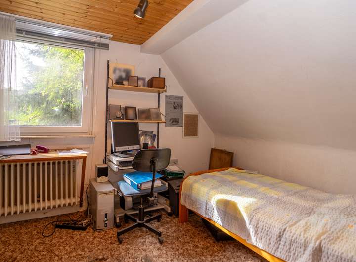 Im Dachgeschoss stehen drei Schlafzimmer sowie ein Badezimmer mit Badewanne zur Verfügung. Der Keller bietet zusätzliche Nutzfläche und Stauraum. Eine alte Zufahrt ist vorhanden und kann bei Bedarf zu einem Stellplatz oder Carport ausgebaut werden.