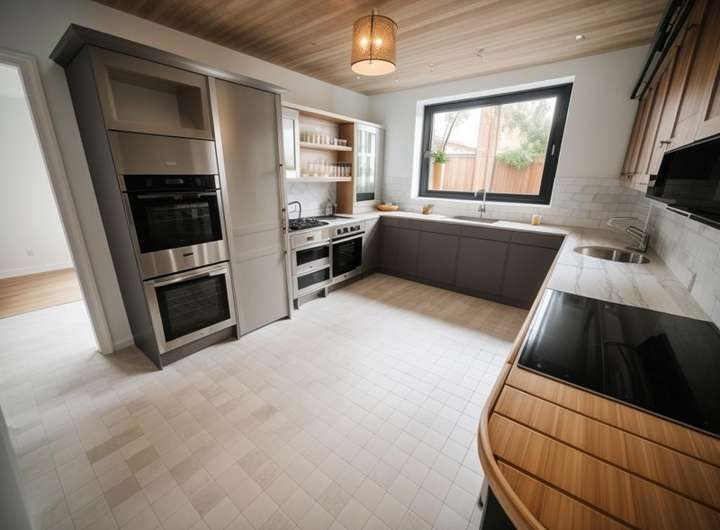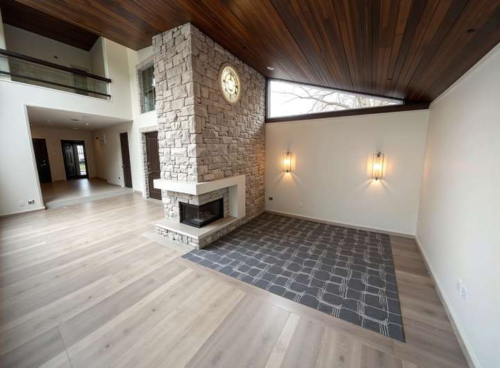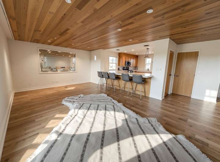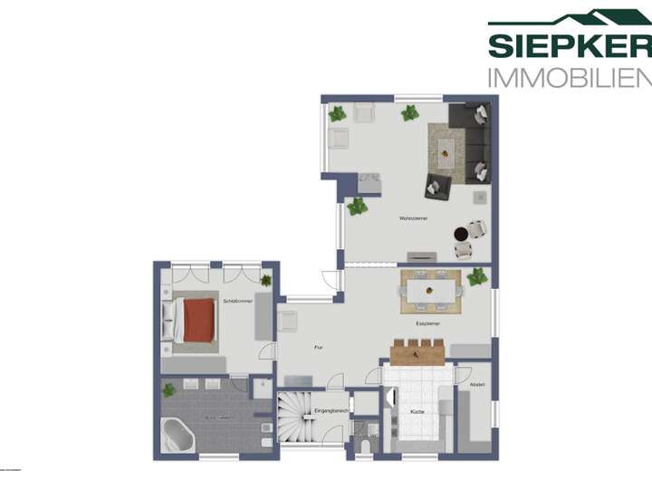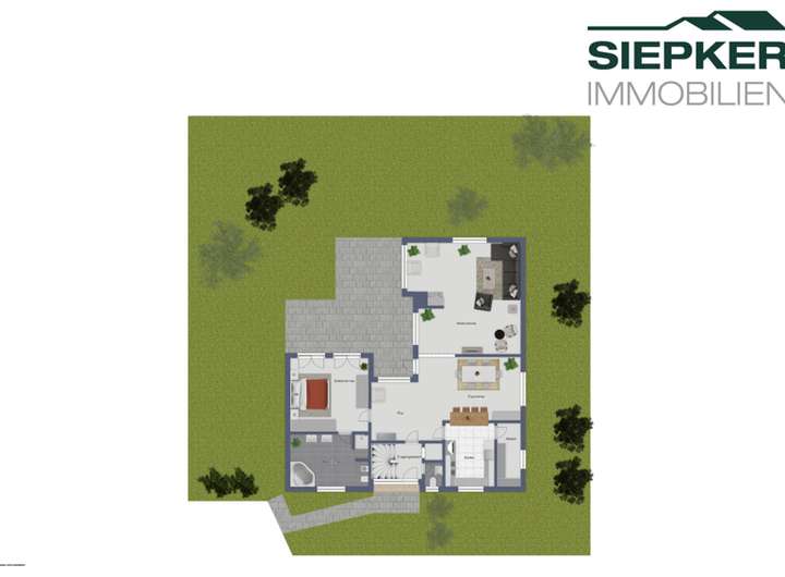 Große Fensterflächen lassen viel Licht in den Wohnbereich. Ein Kamin lädt zum Verweilen ein. Der Essbereich bietet Platz für große Runde. Die offene Küche ist durch einen Tresen vom Essbereich getrennt und verfügt über einen separaten Abstellraum.