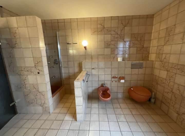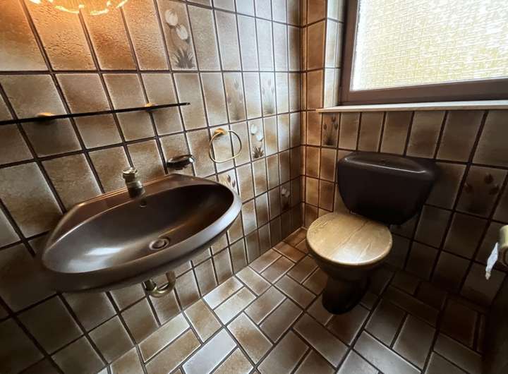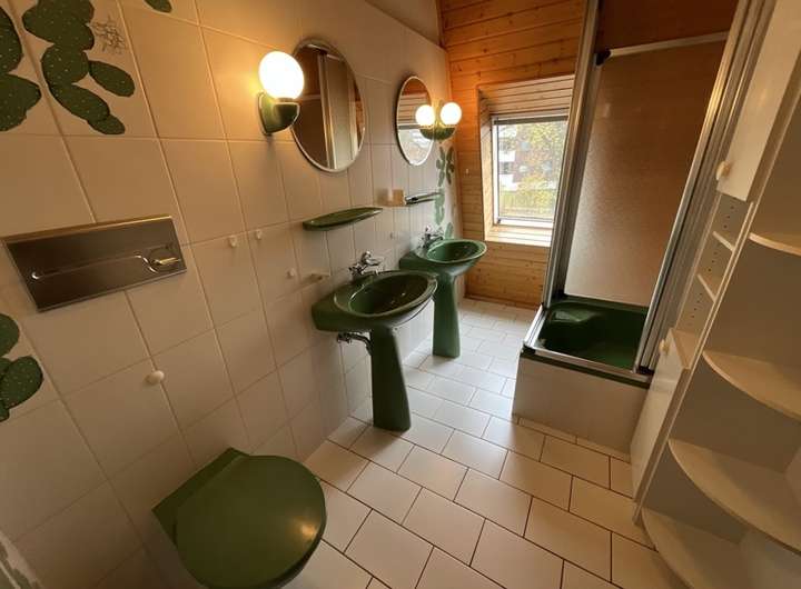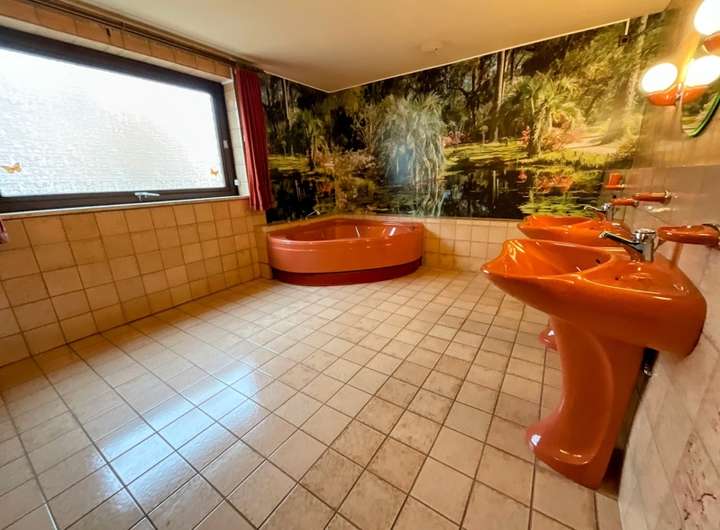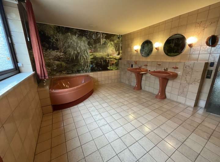 Der Elternschlafbereich befindet sich ebenfalls im Erdgeschoss. Er verfügt über umfangreiche Einbaumöbel die im Haus verbleiben, einen Zugang zur Terrasse sowie ein sehr großes Tageslichtbadezimmer mit Eckbadewanne, Dusche, WC und Bidet. Die Badelemente und Armaturen stammen aus dem Baujahr. Hier lässt sich eine moderne und gemütliche Wellnessoase gestalten und Platz für die Sauna gibt es auch.