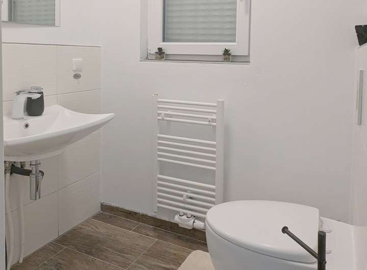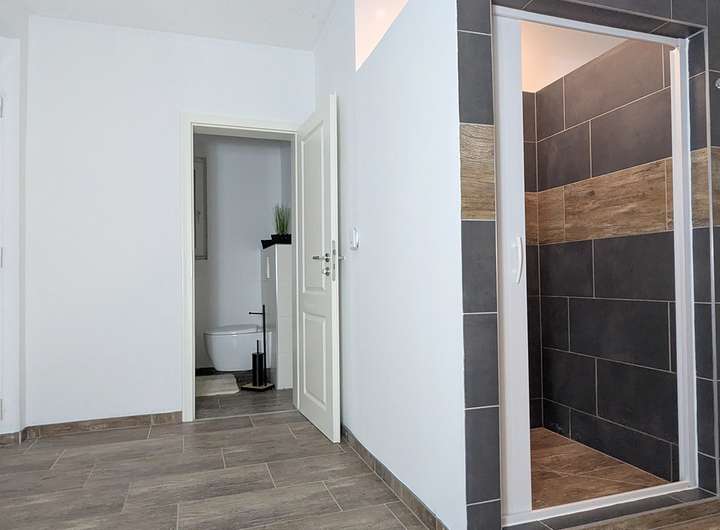 Die Anliegerwohnung ist baulich vom Haupthaus getrennt und über einen eigenen Zugang erreichbar. Sie ist als eigenständige Wohneinheit konzipiert und umfasst einen Wohnbereich, ein Schlafzimmer, ein Badezimmer sowi