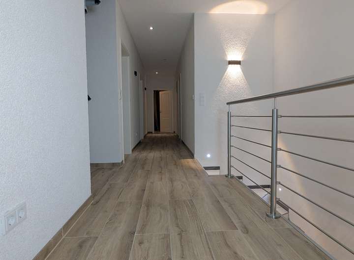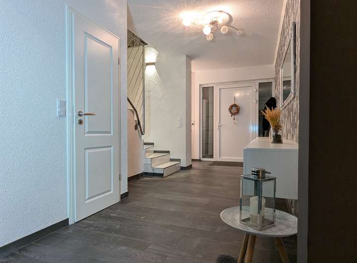 Im Erdgeschoss betreten Sie das Haus über eine einladende Diele Erdgeschoss (Haupthaus): Eingangsdiele mit Garderobenbereich, Flur, Hauswirtschaftsraum, Gäste-WC bzw. Badezimmer (gemäß Grundriss), großzügiger offen gestalteter Wohn- und Essbereich mit integrierter Küche und direktem Zugang zur Terrasse und in den Garten.